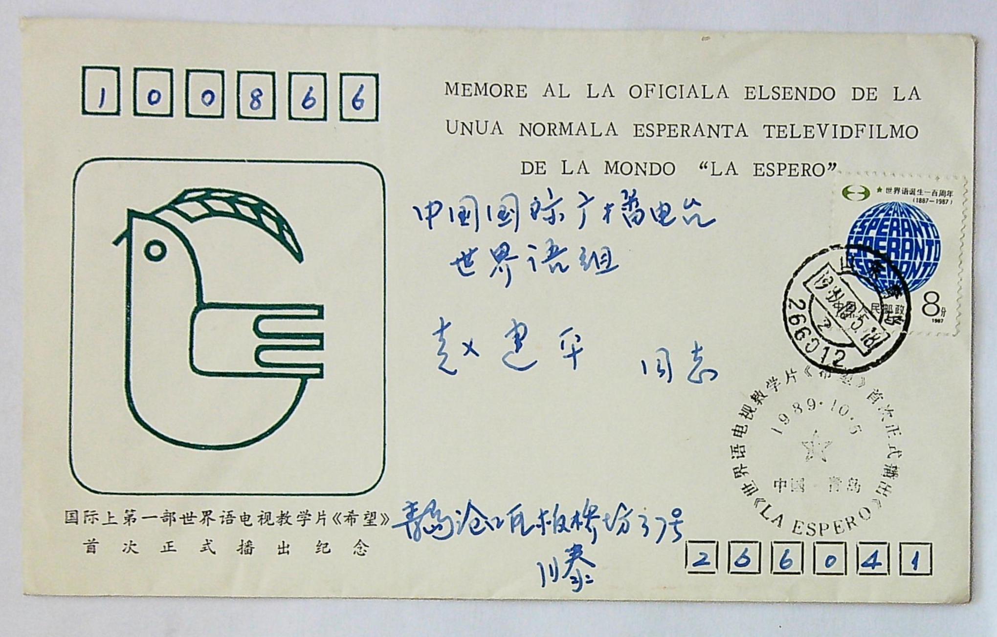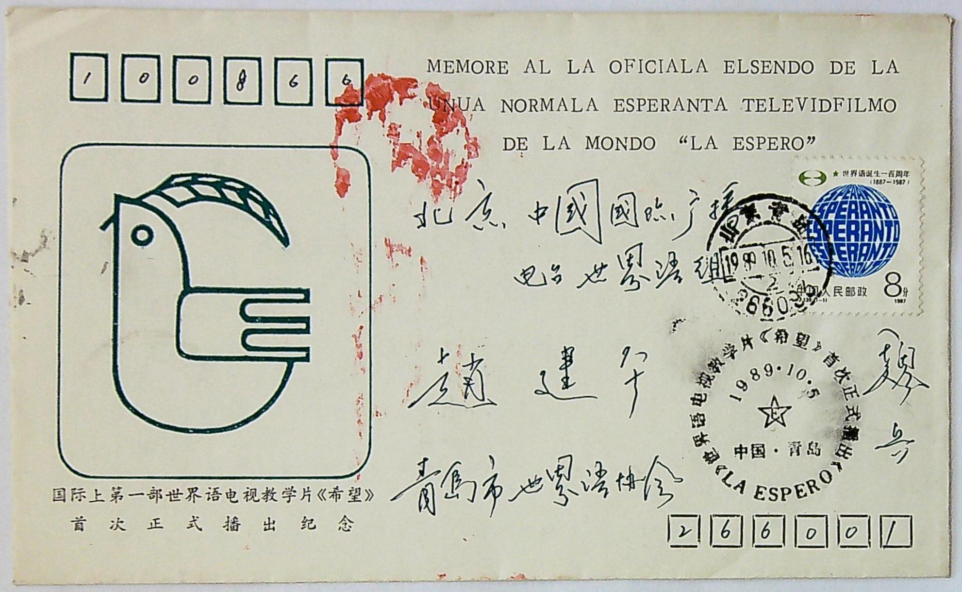 1989年10月5日张道春寄给赵建平世界语希望电视教学片首次正式播出纪念封