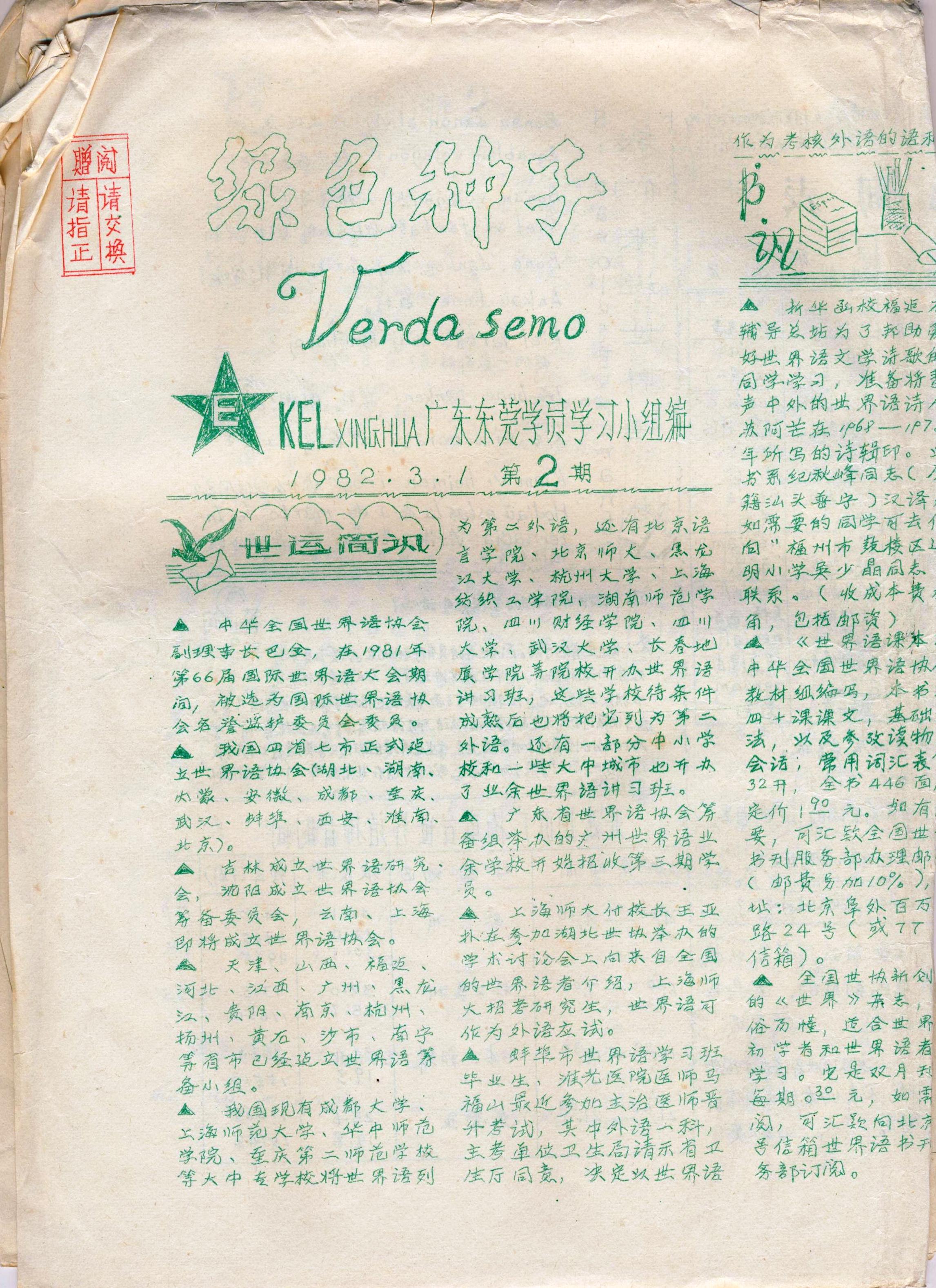 新华世界语函授学校广东东莞学员学习小组《绿色种子》1982年第