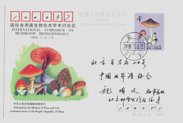 1989年11月6日任宇寄给祝明义的“国际食用菌生物技术学术讨论会”明信片