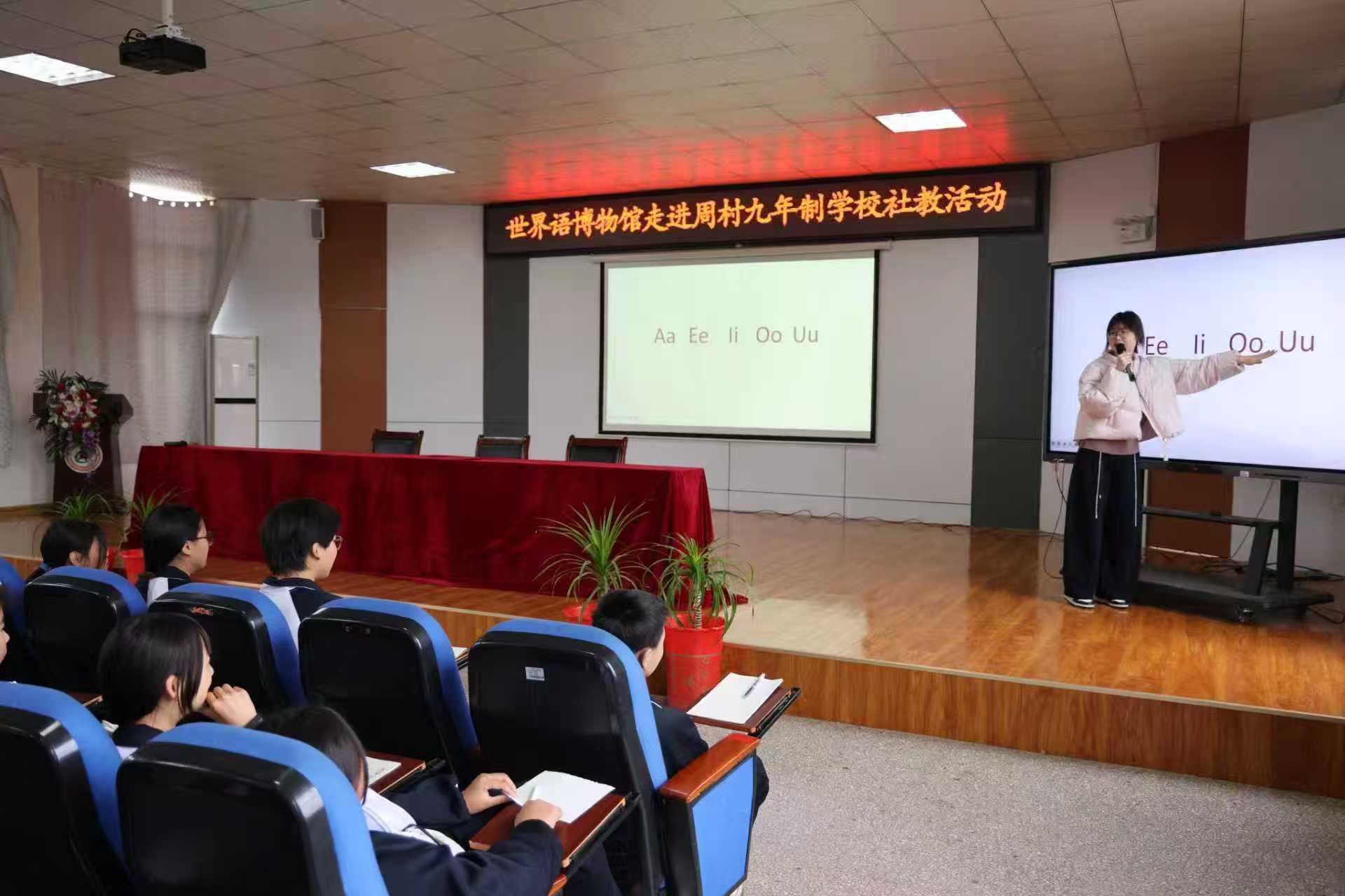 首页 > 工作动态“世界语进校园”活动在周村九年制学校 成功举办为拓宽学生国际视野,发挥博物馆社教功能,助力校园文化建设,4月9日,我馆走进周村九年制学校,开展了“世界语进校园”活动。中华全国世界语协会常务理事、世界语博物馆常务副馆长、建设研究专家孙明孝,枣庄市国学教育促进会会长刘伟、副会长张兆宽,市中区教体局关工委常务副主任程恒田,学校党支部书记陈秋礼,副校长李涛、宋兆鸿参加了活动。