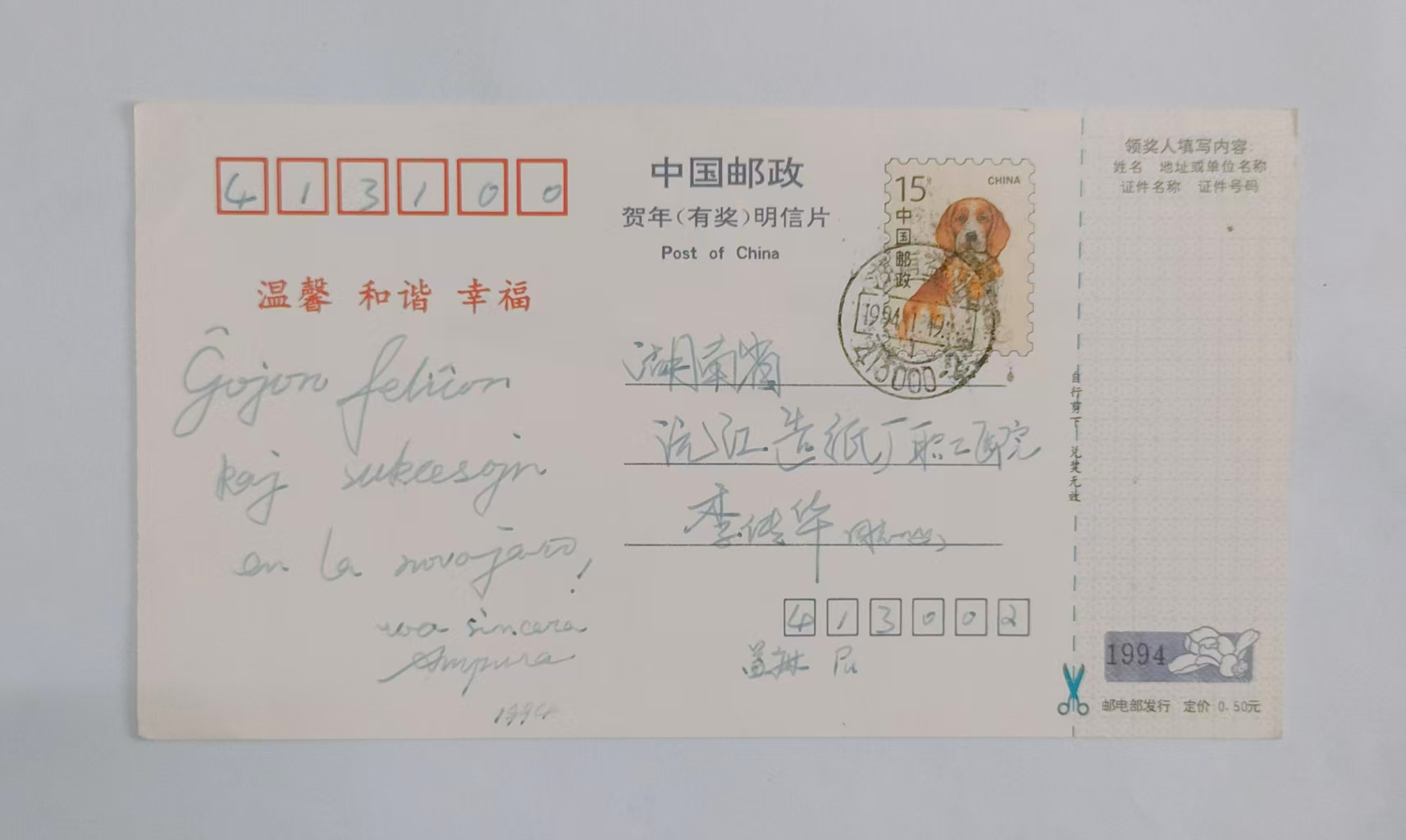 1994年某pu世界语者寄给李传华的贺年明信片