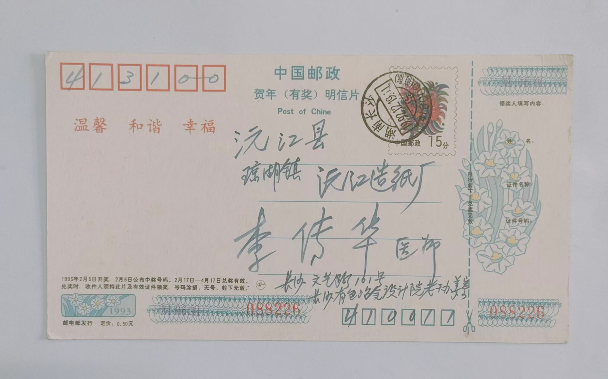 1992年姜祖岳寄给李传华的贺年明信片