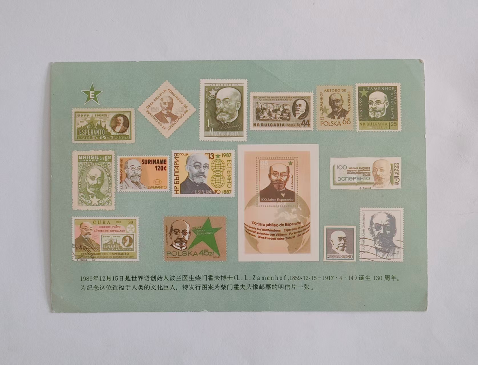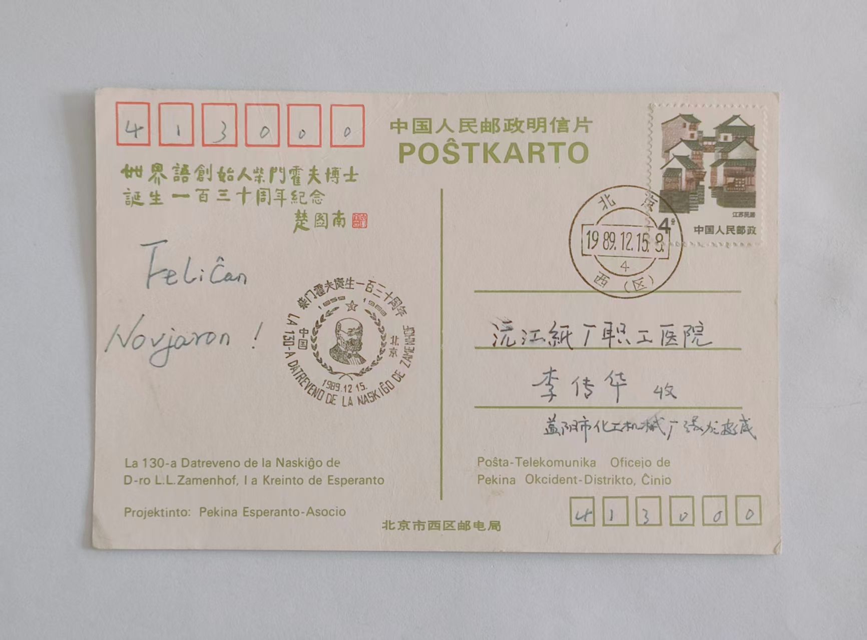 1989年张力波寄给李传华纪念世界语创始人柴门霍夫博士诞生一百三十周年明信片