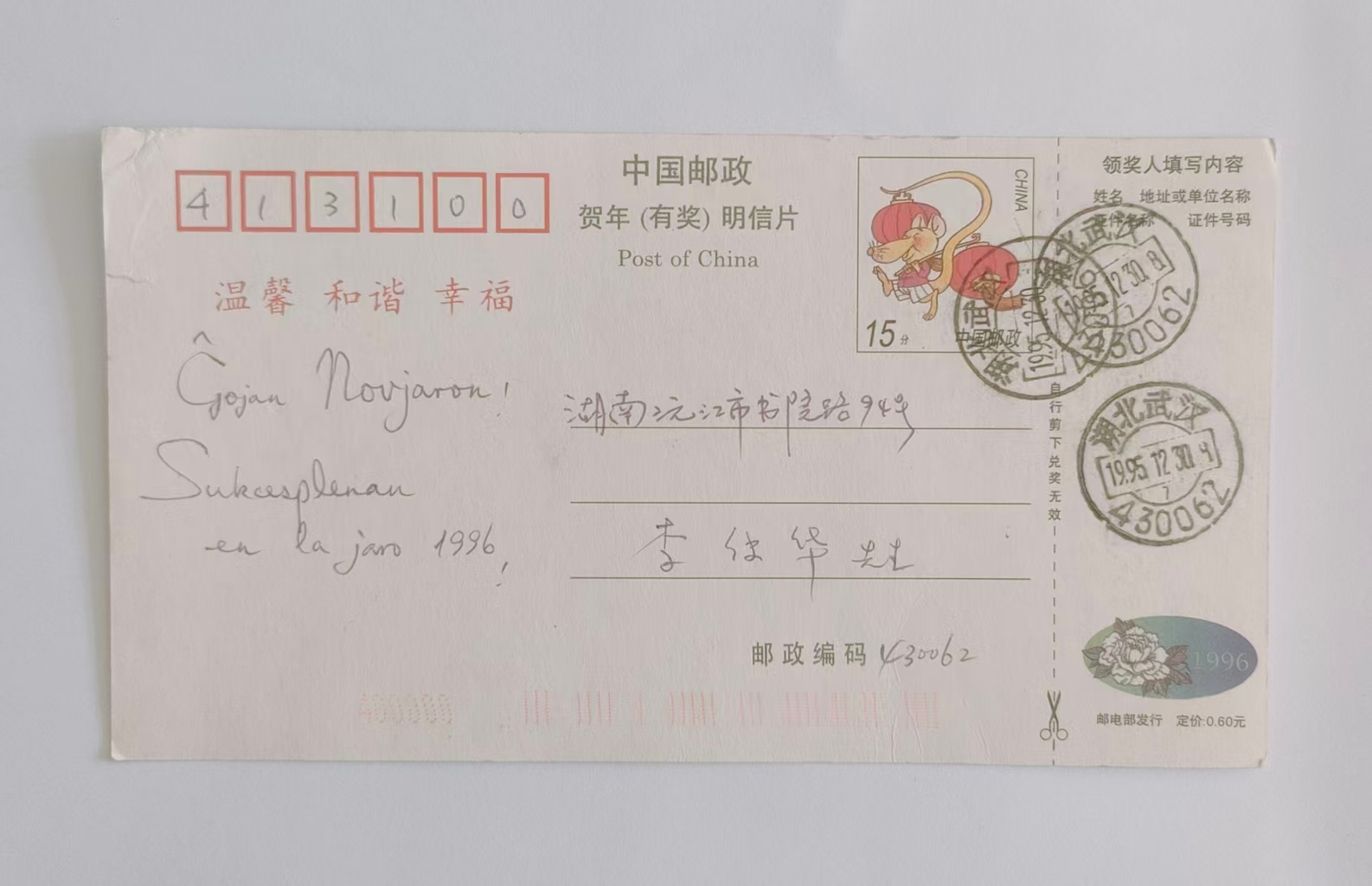 1995年彭健君寄给李传华的贺年明信片