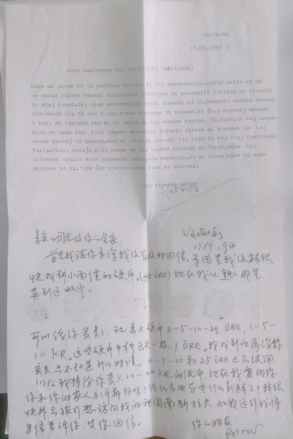 1992年9月17日瑞典世界语者Petrov寄给李传华的信件