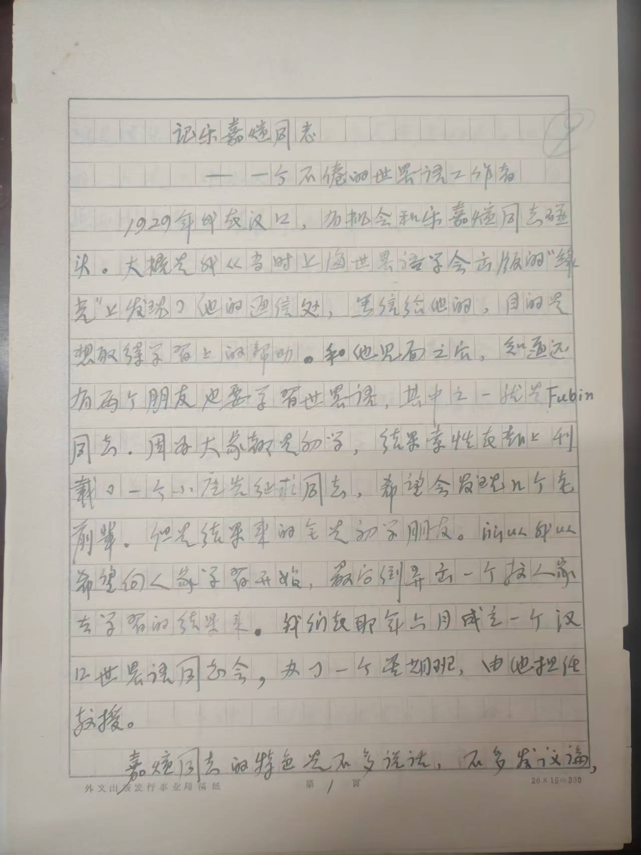 方善镜手稿《访乐嘉煊同志--一个不倦的世界语工作者》