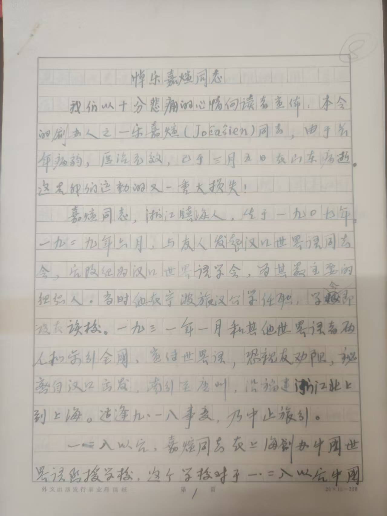 方善镜手稿《访乐嘉煊同志--一个不倦的世界语工作者》