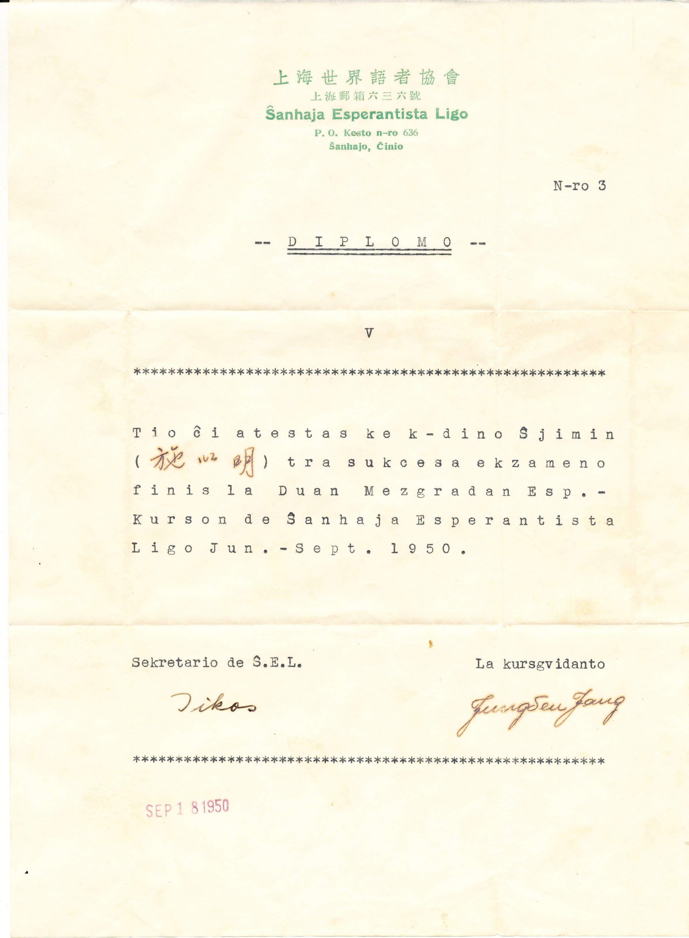 施以明上海世界语协会学习班毕业证明