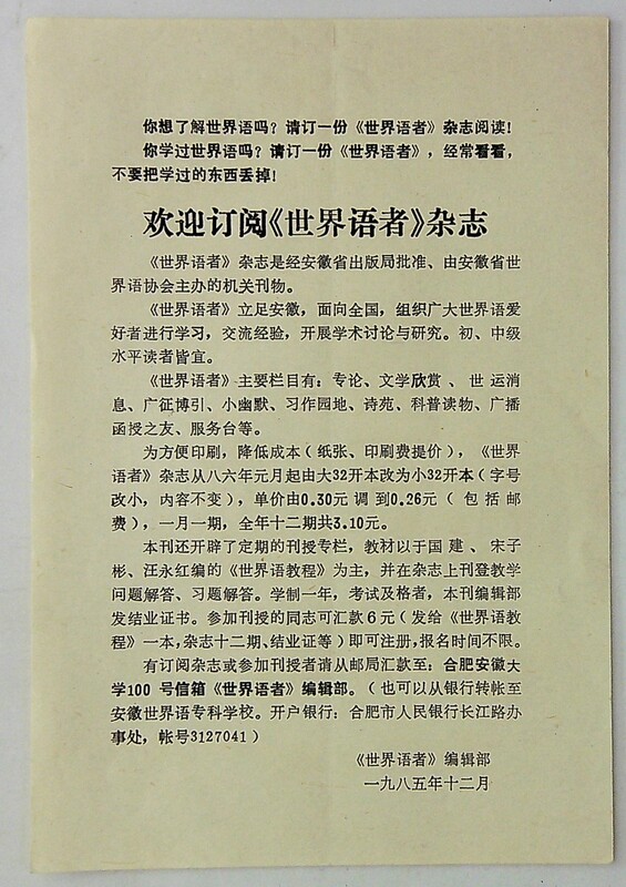 1985年12月《世界语者》编辑部“欢迎订购《世界语者》杂志”