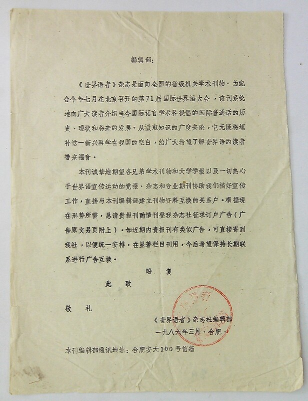 1986年3月《世界语者》编辑部“关于刊登杂志社征求订户广告的通知”