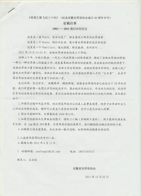 《希望之歌飞过三十年》(纪念安徽世界语协会成立30周年专刊)征稿启事