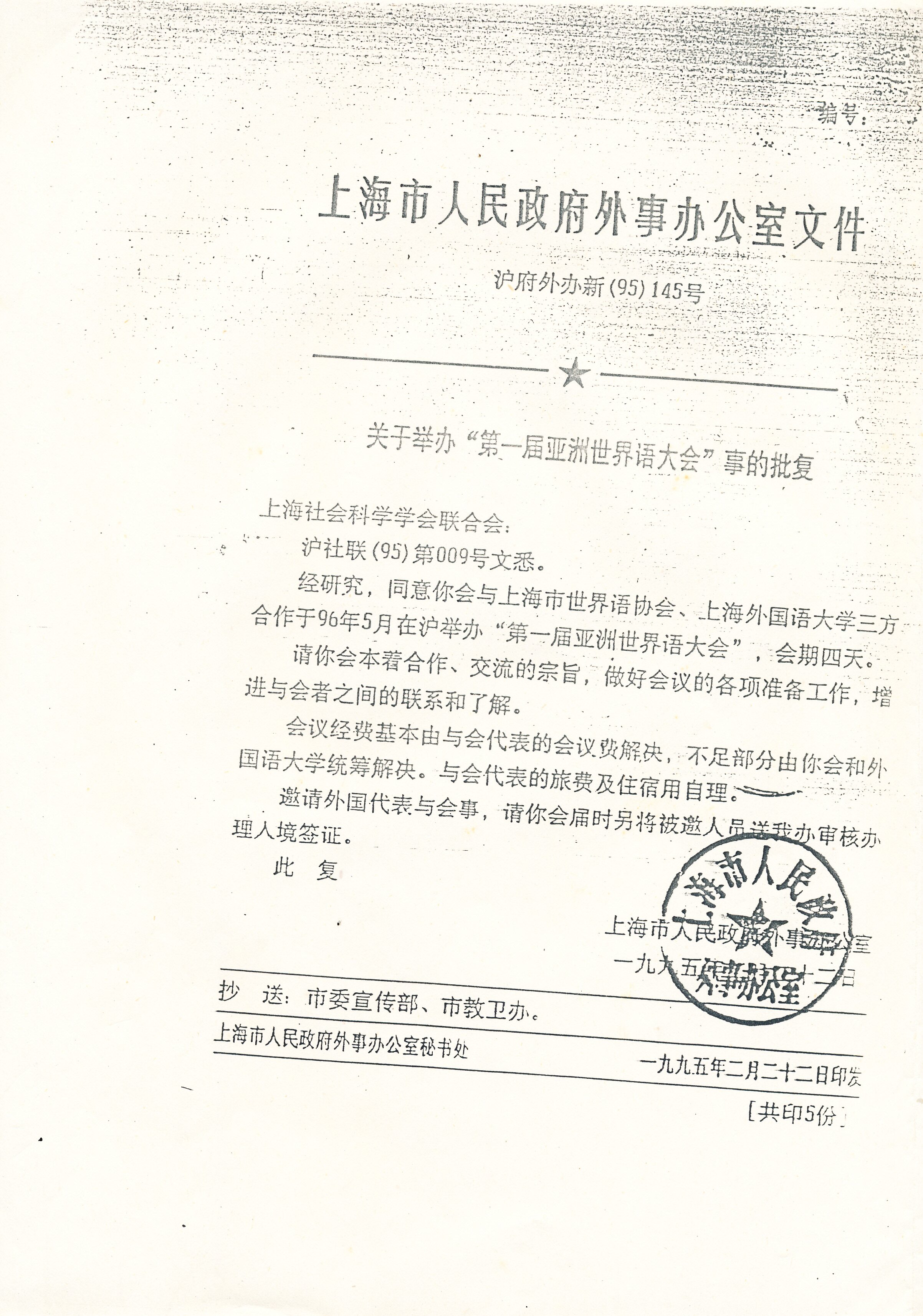1995年上海市人民政府外事办公室关于举办“第一届亚洲世界语大会”事的批复(复印件))