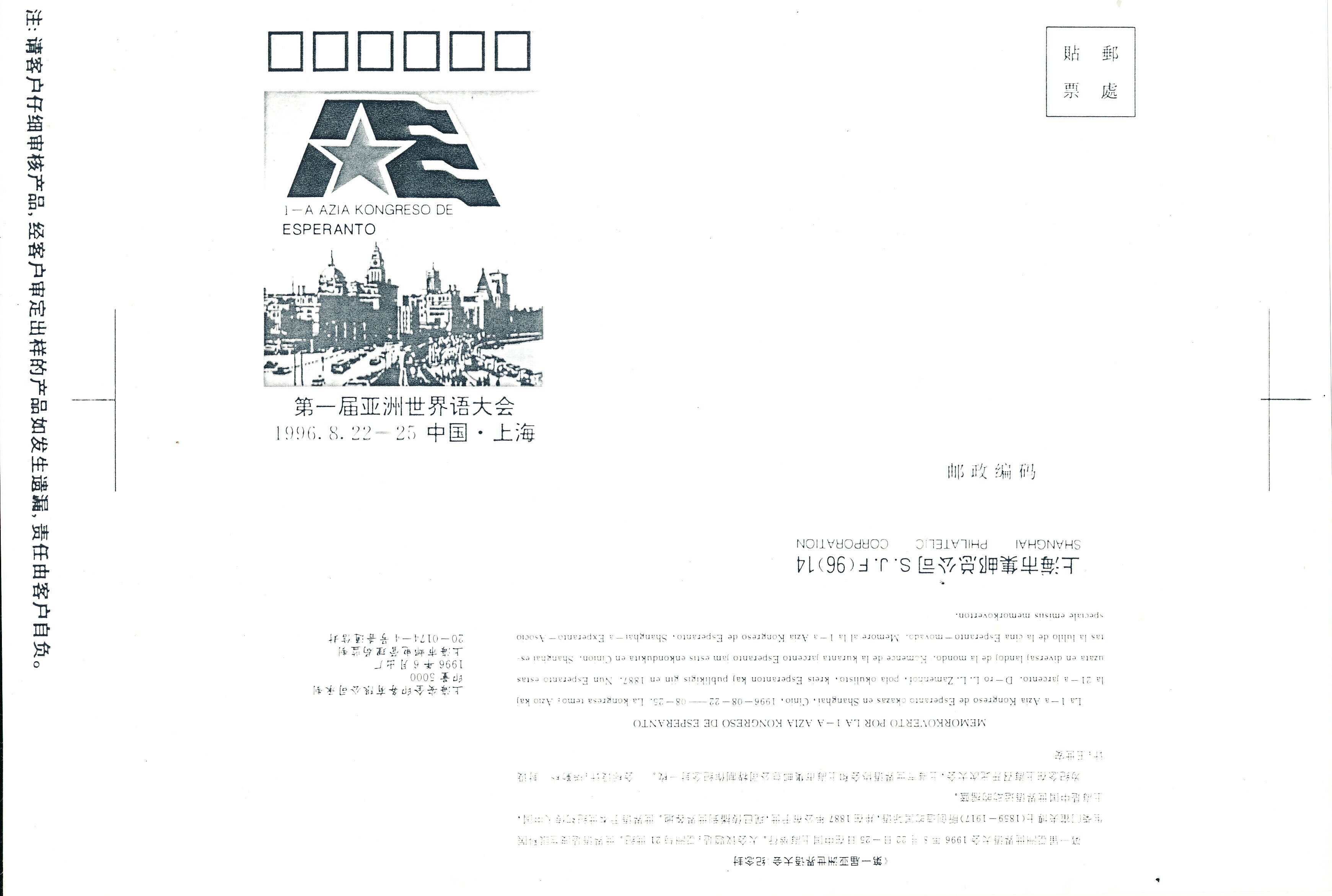 1996年第1届亚洲世界语大会纪念封设计稿