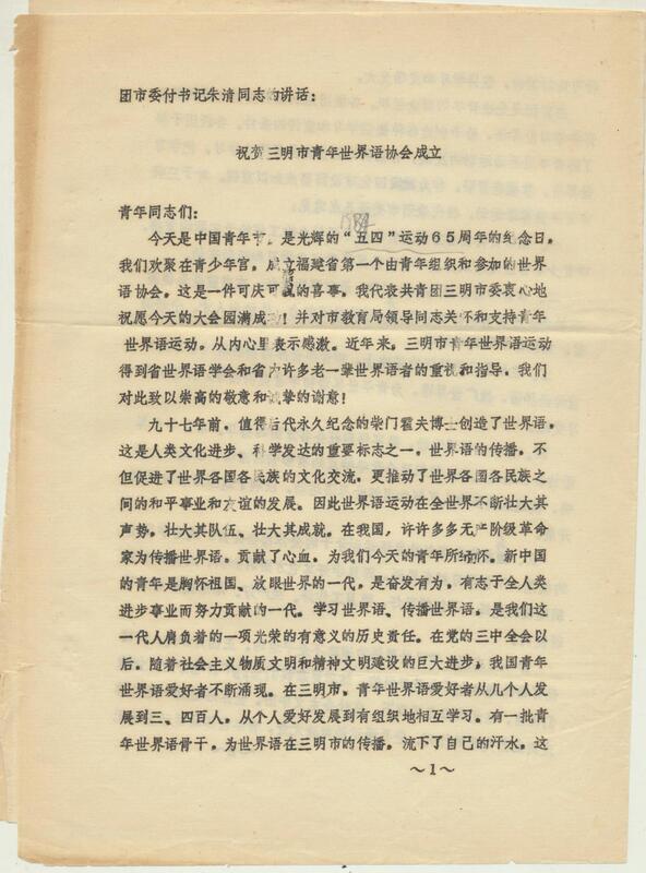 1984年福建省三明市团市委副书记朱清的讲话:祝贺三明市青年世界语协会成立》