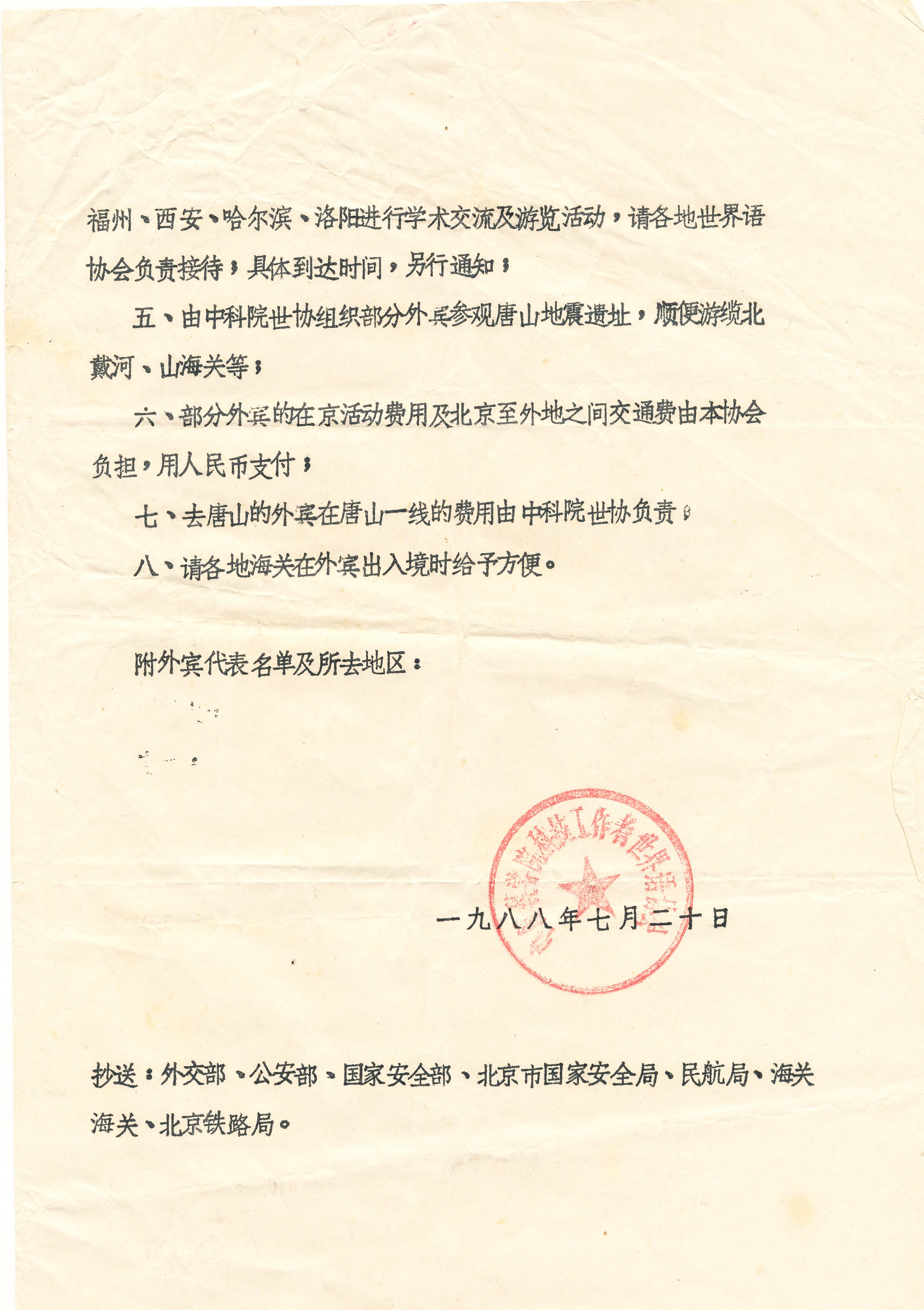 1988年北京关于第二届国际世界语科技学术会议外宾接待计划