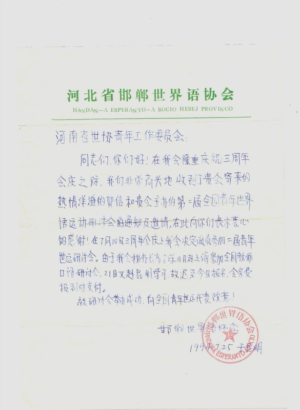 1994年7月25日邯郸世界语协会致河南省青年世界语协会的回函