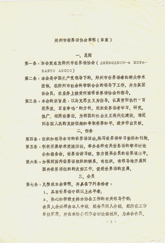 1986年4月郑州市世界语协会章程(草案)