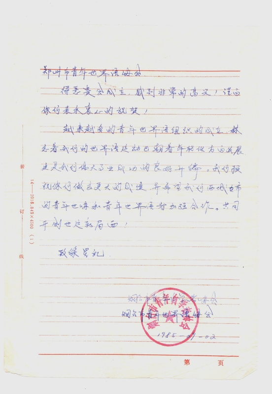 1985年9月2日烟台市青年世界语协会致郑州市青年世界语协会成立的贺信