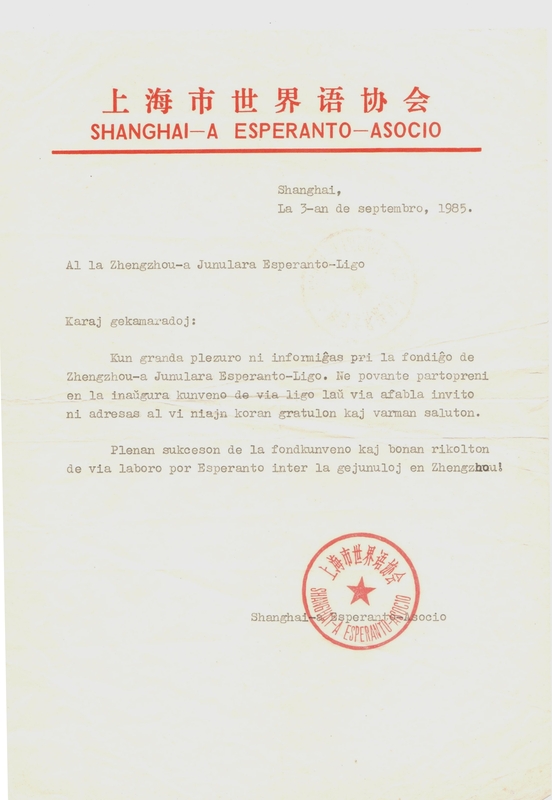1985年9月3日上海市世界语协会致郑州市青年世界语协会成立的贺信