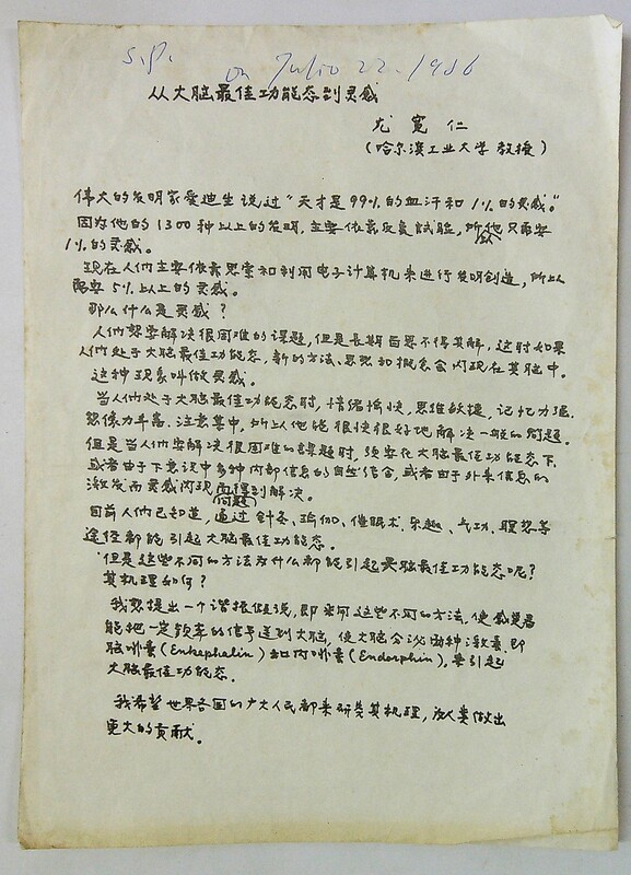 1986年7月22日尤宽仁《从大脑最佳功能态到灵感》中文译本(哈工大教师)