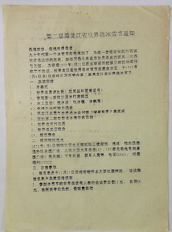 1989年11月23日黑龙江省世界语冰雪节组委会“关于第二届黑龙江省世界语冰雪节的通知”