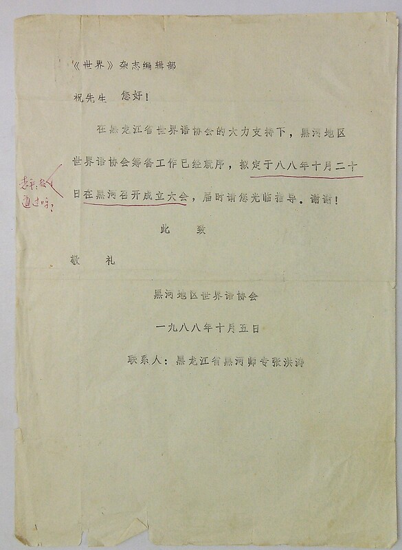 1988年10月5日黑河地区世界语协会给《世界》杂志编辑部祝明义的信