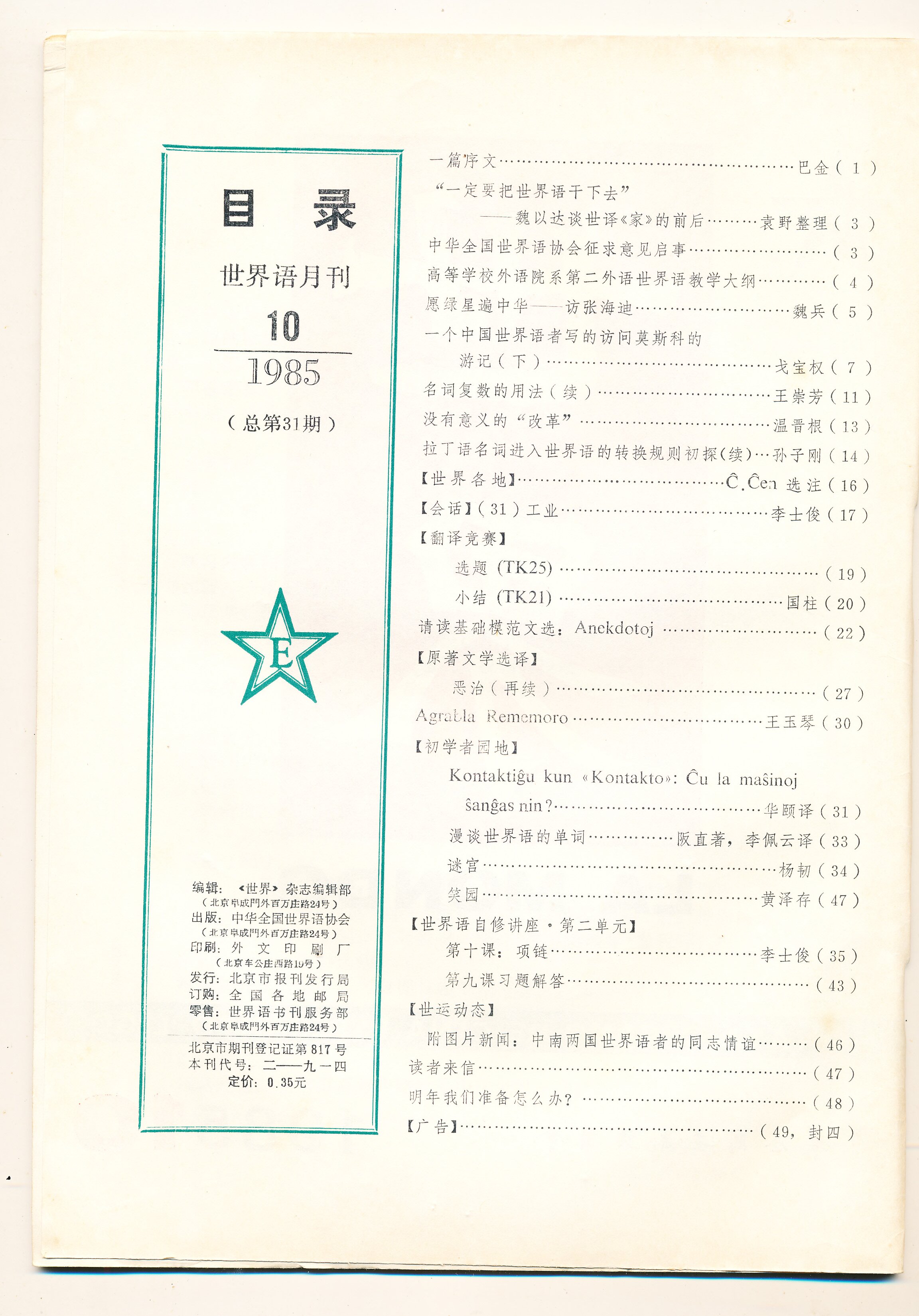 1985年北京《世界》第10期(总第31期)