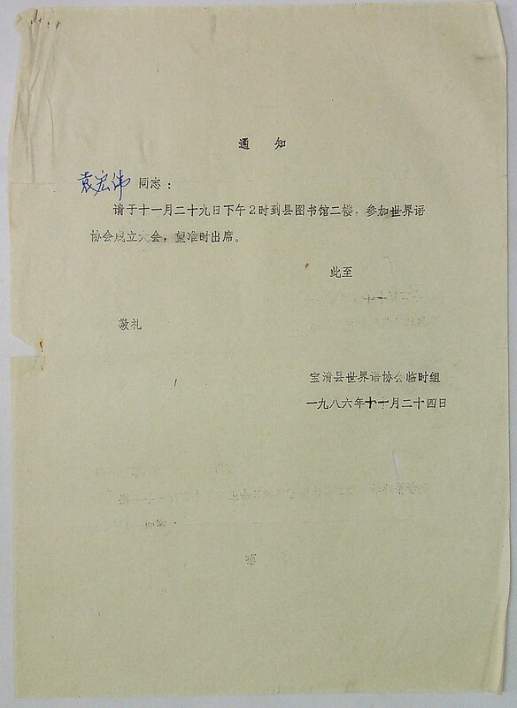1986年11月24日宝清县世界语协会临时组“关于参加世界语成立大会的通知”