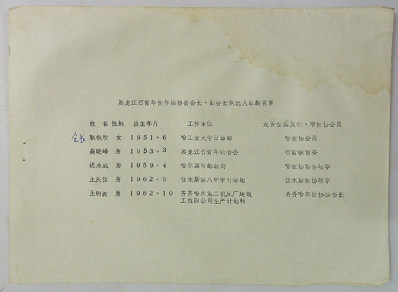 1986年黑龙江省青年世界语协会会长、副会长候选人酝酿名单
