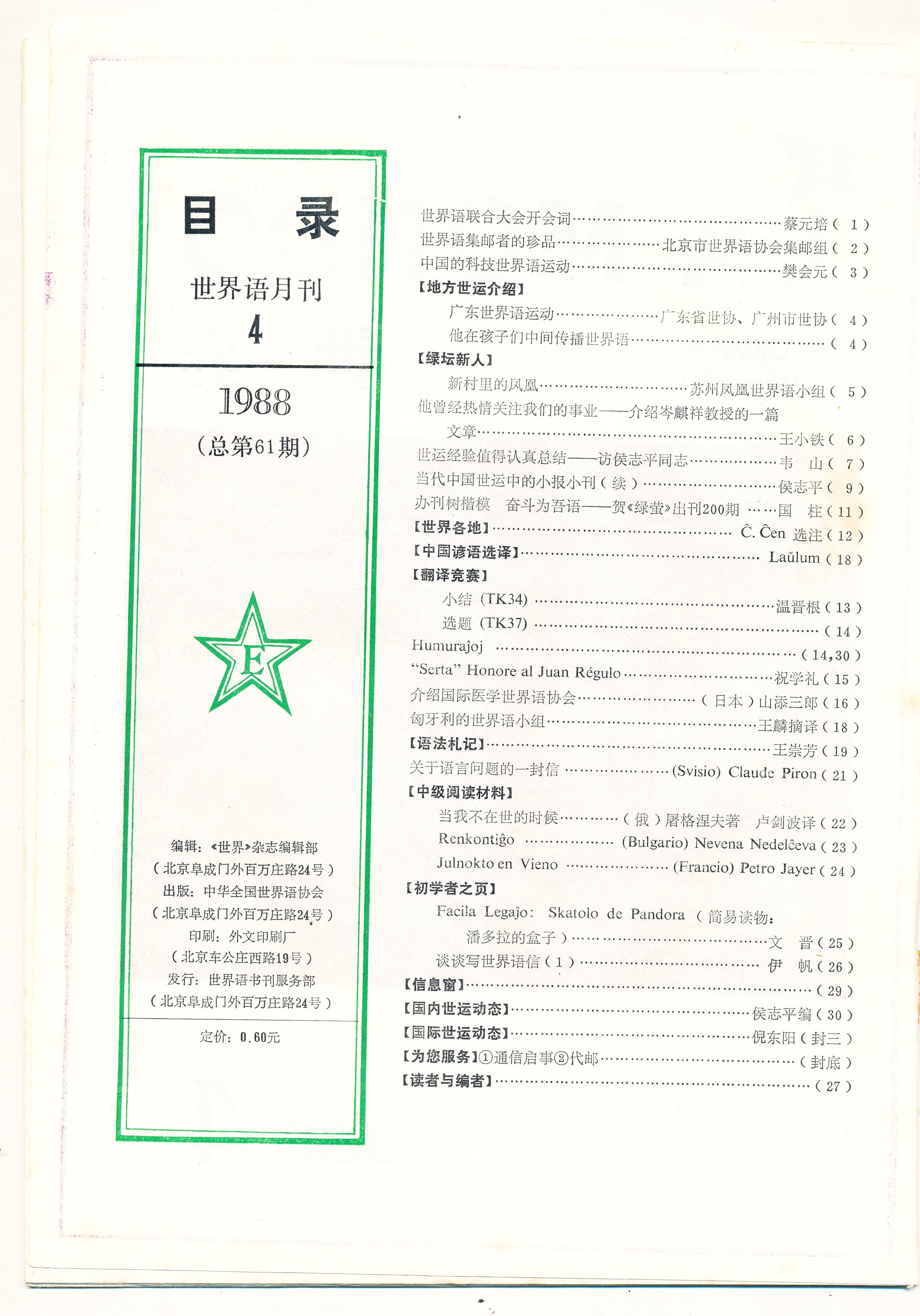 1988年北京《世界》第4期(总第61期)