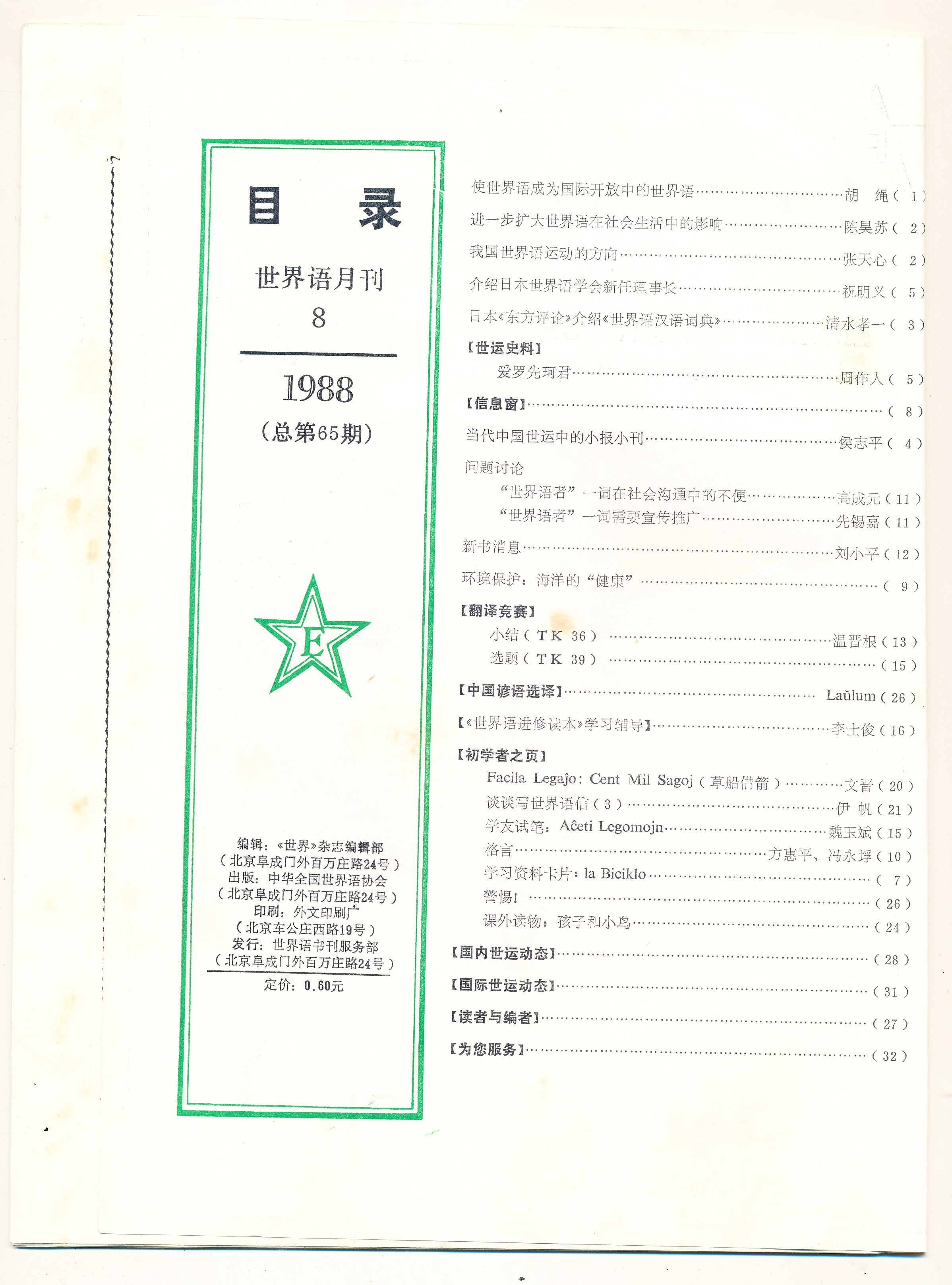 1988年北京《世界》第8期(总第65期)