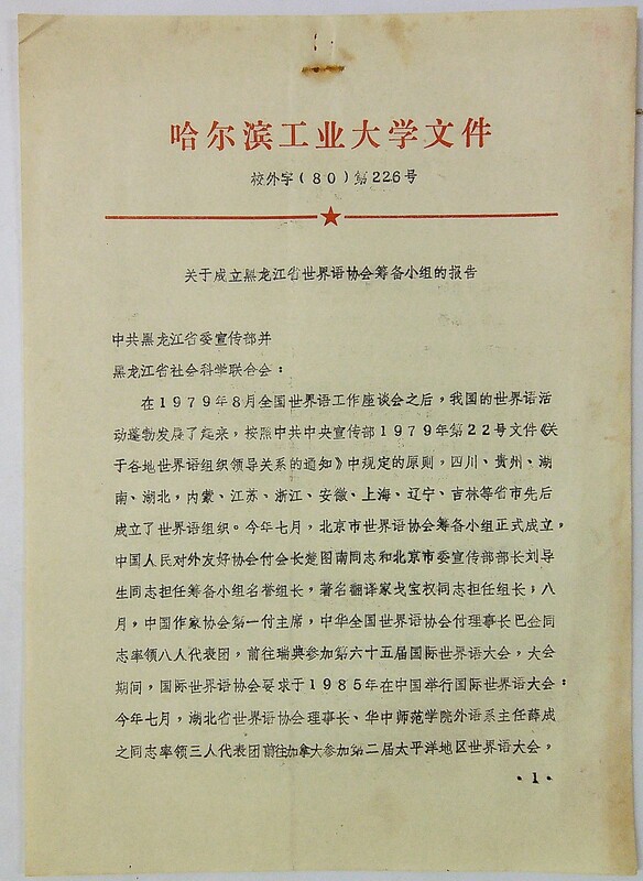 1980年11月27日哈尔滨工业大学“关于成立黑龙江省世界语协会…