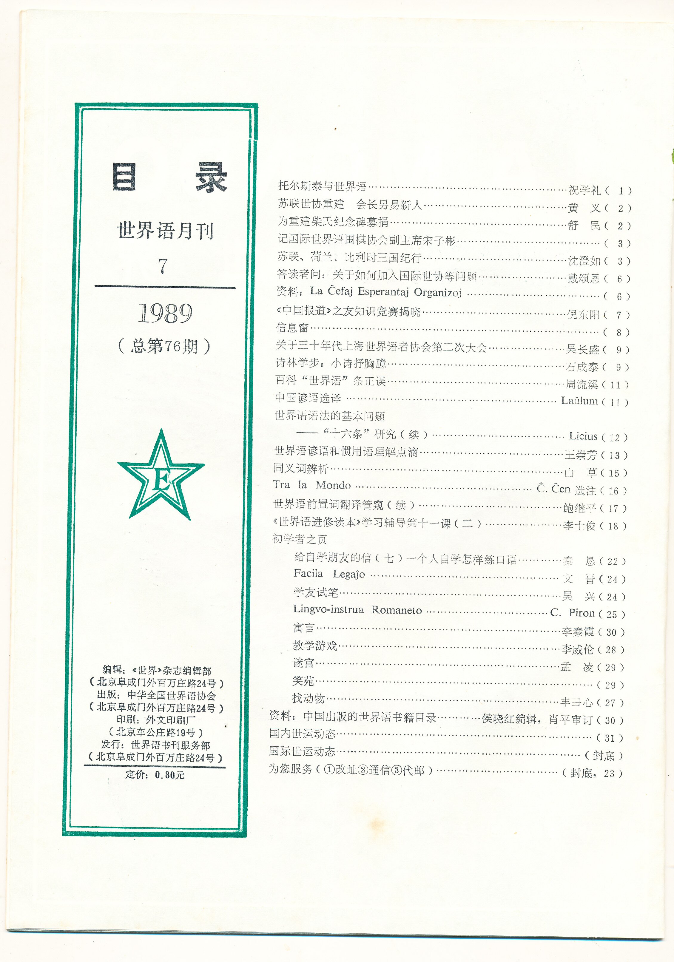 1989年北京《世界》第7期(总第76期)