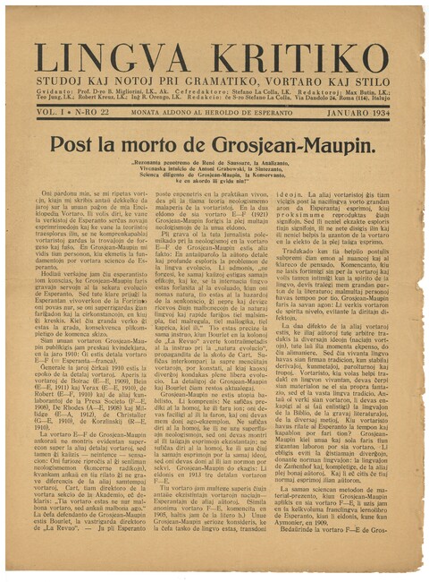 1934年1月罗马出版的第1卷第22期Linva Kritiko(语言批判)