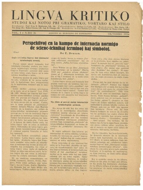 1934年10月罗马出版的第1卷第26期Linva Kritiko(语言批判)