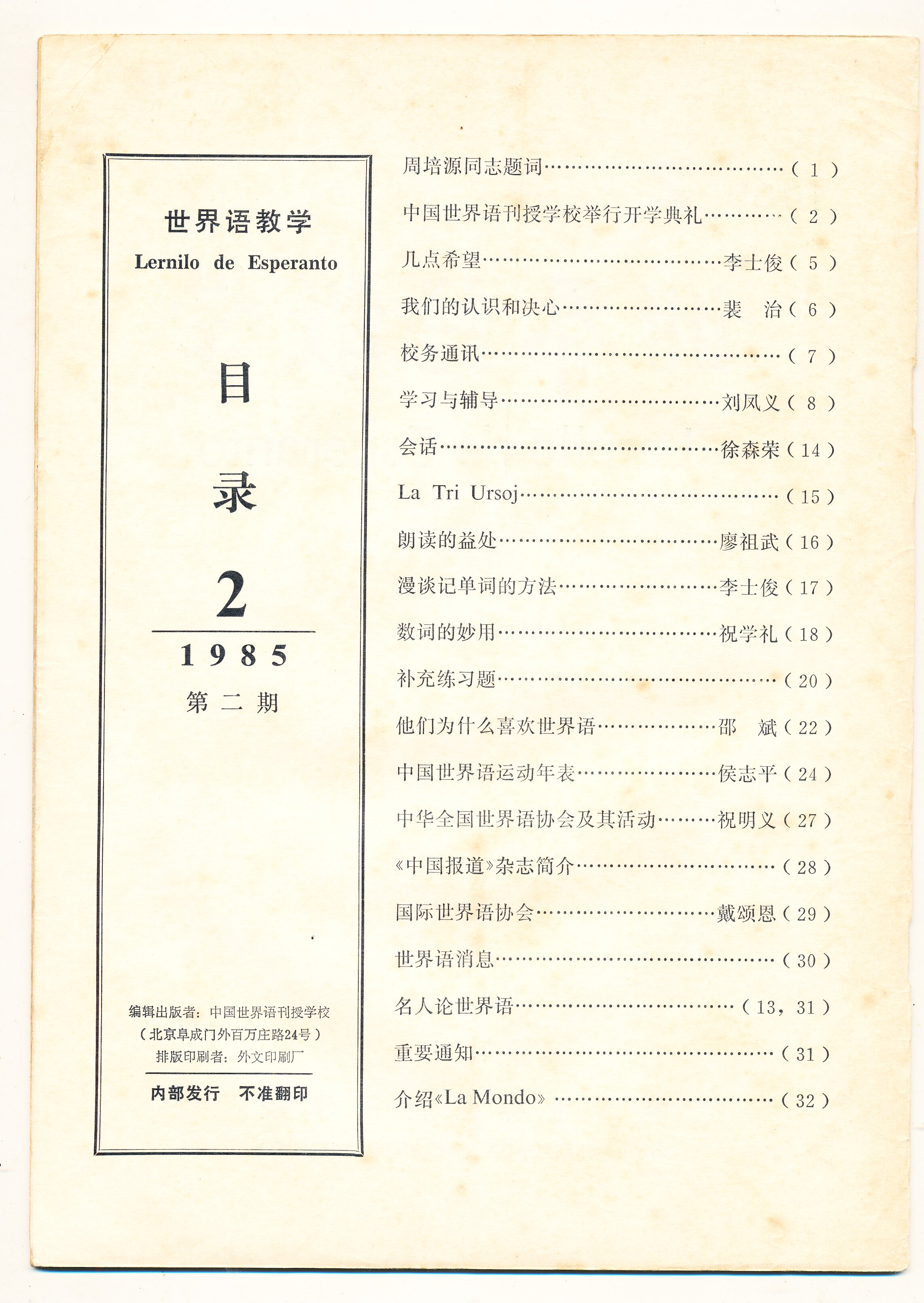 1985年北京《世界语教学》第2期