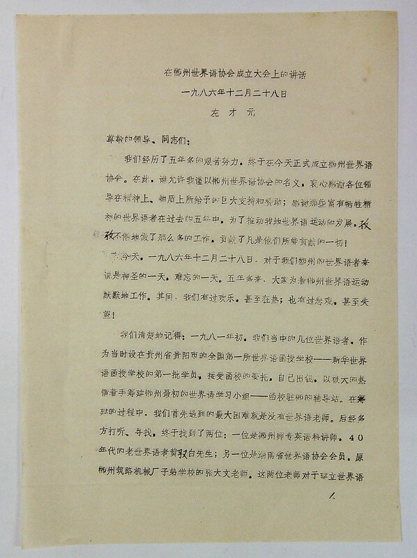 1986年12月28日左才元在郴州世界语协会成立大会上的讲话稿