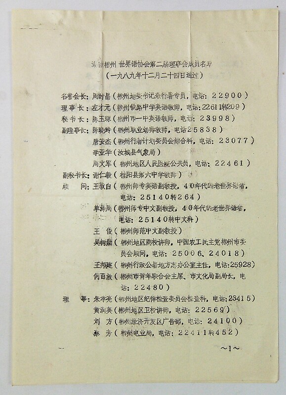 1989年12月24日郴州世界语协会第二届理事会成员名单