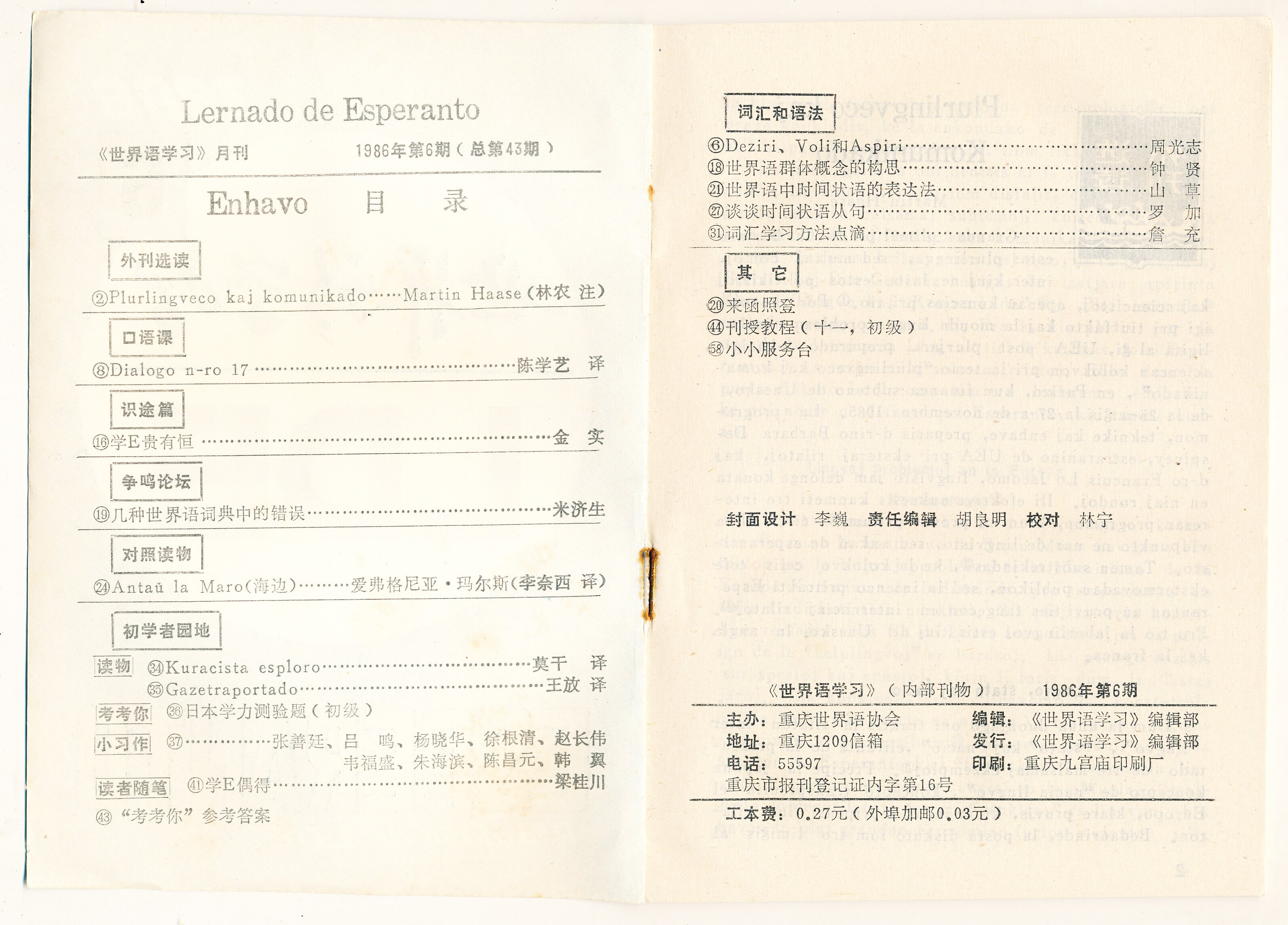 1986年重庆《世界语学习》第6期(总第43期)
