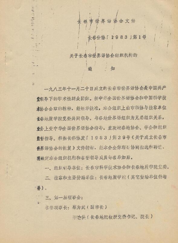 1983年11月20日长春世协[1983]第1号文件 关于长春市世界语协会组织机构的通知