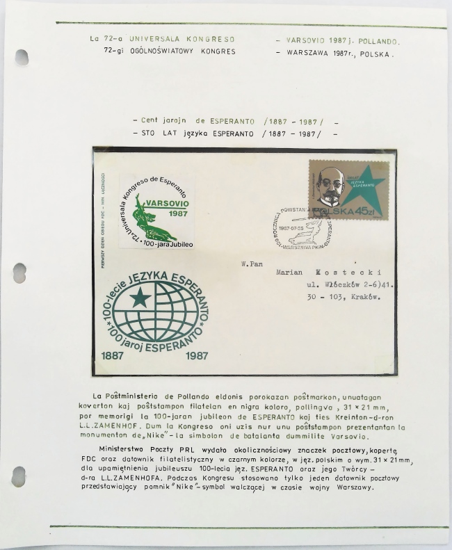 1987年华沙第72届国际世界语大会实寄封展片