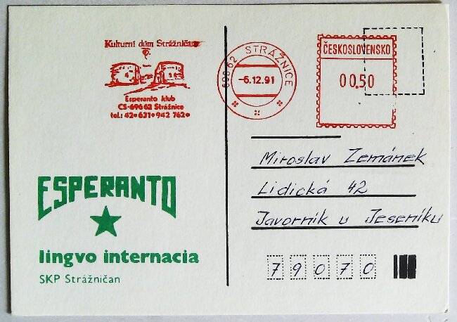 1991年捷克斯洛伐克世界语俱乐部纪念戳(载体明信片)