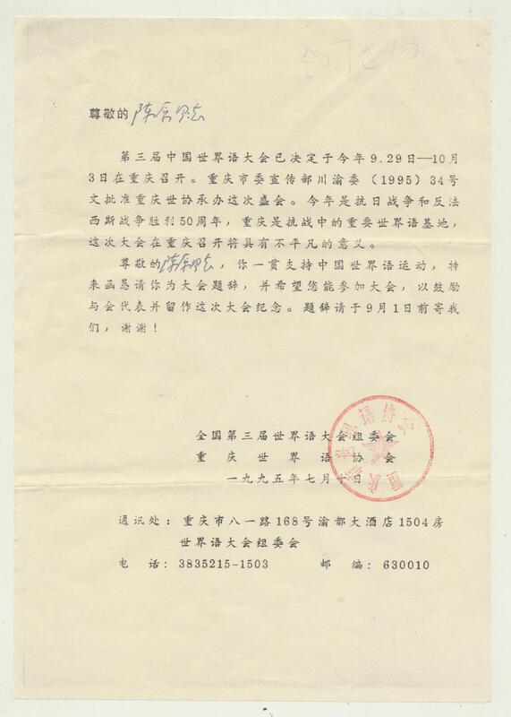 1995年7月10日全国第三届世界语大会组委会致陈原同志的邀请书
