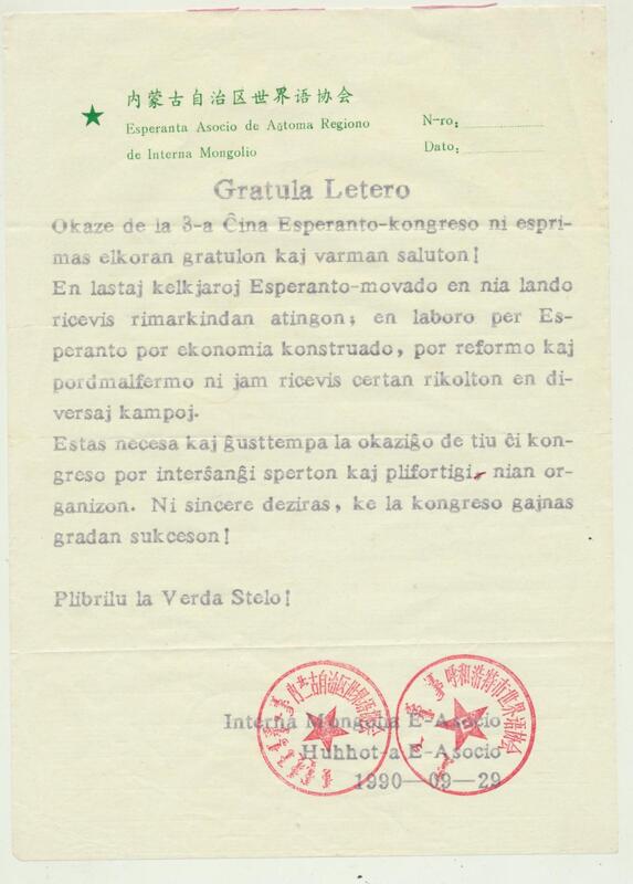 1995年9月26日内蒙古世界语协会祝第三届全国世界语大会成功举办的贺信