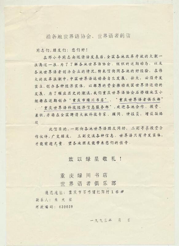 1993年重庆绿川书店世界语者俱乐部致各地世界语协会、世界语者的信