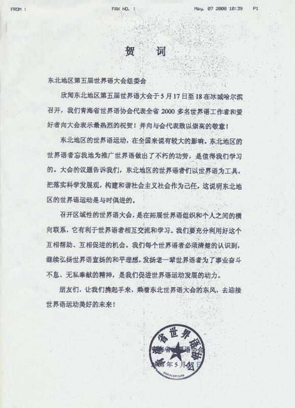 2008年青海省世界语协会致东北地区第五届世界语大会组委会的贺词