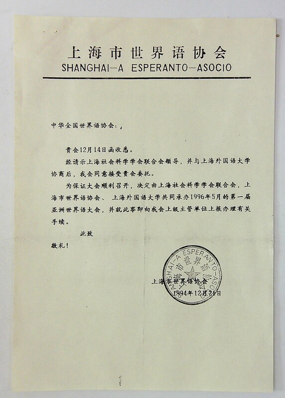 1994年12月21日上海市世界语协会给中华全国世界语协会“关于召开第一届亚洲世界语大会”的函