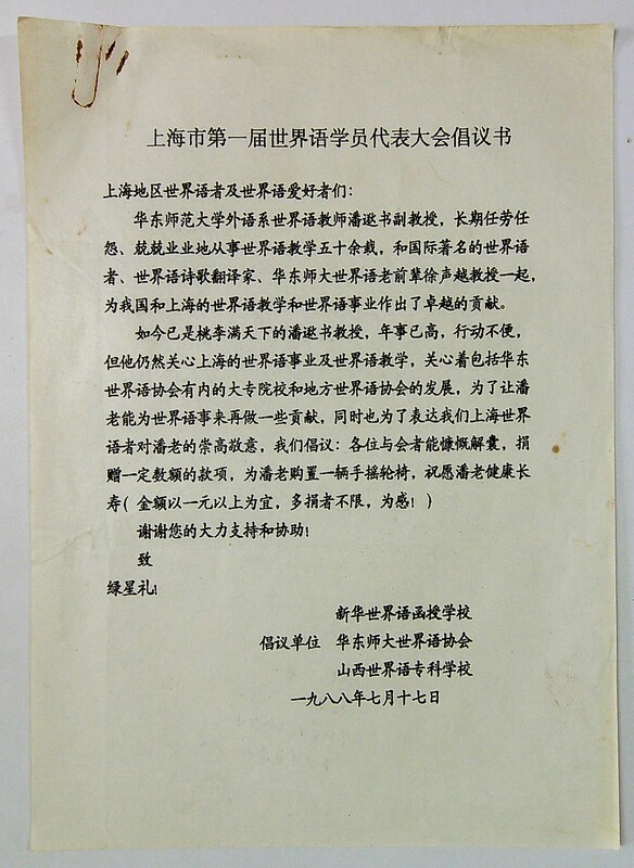 1988年上海市第一届世界语学员代表大会倡议书