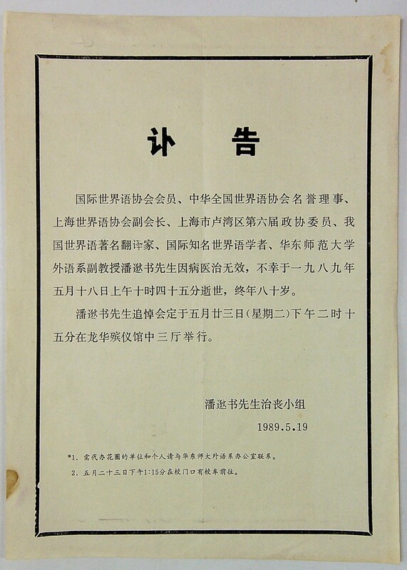 1989年潘逖书先生的讣告