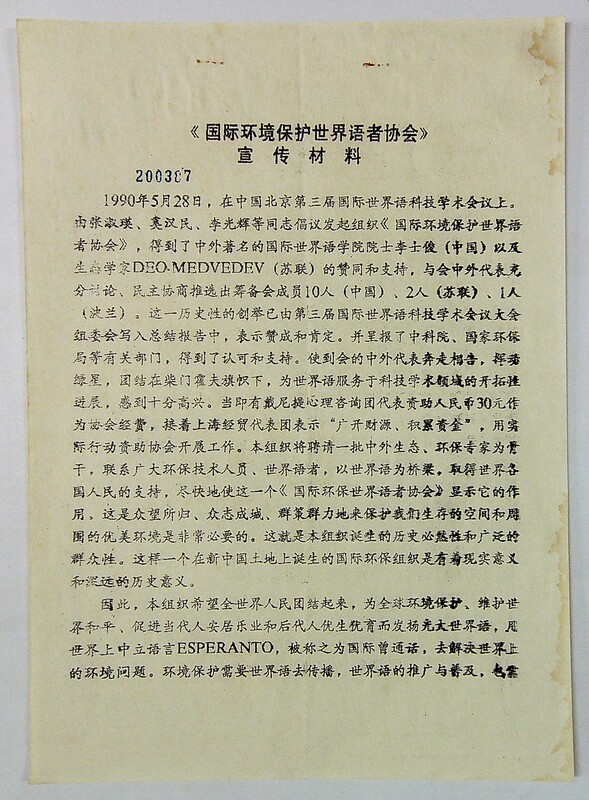 1990年《<国际环境保护世界语者协会>宣传材料》